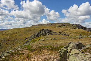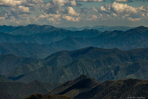 Солнышко припекало, небольшие тучки радовали глаз. Со склона Босана далеко перед нами раскинулись волны гор и мы шли по гребню одной из таких волн. Первую остановку и отдых сделали у скал Три Толстяка. Далее по хребту шла вершина и, зайдя на нее, мы наконец увидели во всей красе Маргасанскую сопку с ее чудесной треугольной вершиной!