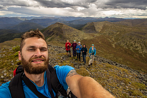 Штурмовая группа состояла из самых подготовленных ребят, поэтому пошли быстро и на вершине пика Босан, который был на пути, оказались всего через час после выхода из лагеря! Чуть ранее, по пути вдалеке увидели мужика с рюкзаком, идущего на Босан. Он нас тоже увидел и шел быстрее, чем мы налегке. Видимо испугался, что сейчас займем вершину и не дадим отдохнуть или пофоткать) Встретились уже между скал вершины. Он успел на тот момент подняться наверх и при нашем приближении спустился со скалы и начал накидывать рюкзак. В глазах его читалось сильное удивление и непонимание, когда мы очень бодро прошли... мимо него и вершины