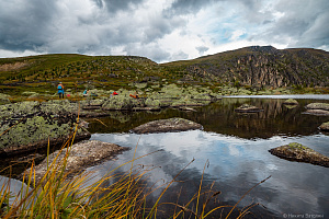 На обратном пути заглянули на озеро у подъема на хребет. Вымочили в нем уставшие ноги, удивились большим валунам, устилающим дно. На подъеме дождик все таки догнал нас и уронил примерно три капли. Промокнуть не получилось) Зато видели, как по долине идут косые полосы ливня - зрелище космическое! В лагере вся трава оказалась немножко мокрой - дождь побывал здесь на 5-10 минут.