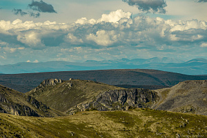С вершины Маргасанской сопки виды совсем не такие, как на всем остальном маршруте этого похода. вокруг - трапповые горы, полосатые и интересненькие! Похоже на Исландию или на плато Путорана. Вдали видно Тункинские Гольцы. В них зарождаются тучи и довольно быстро ползут в нашу сторону. Пока у нас хорошая погода, но та половина неба быстро чернеет. Приходится выдвигаться назад - неохота долго топать под дождем, лучше быстрее оказаться в лагере. Главное - вершину посетили, значит маршрут отработан на 100%.