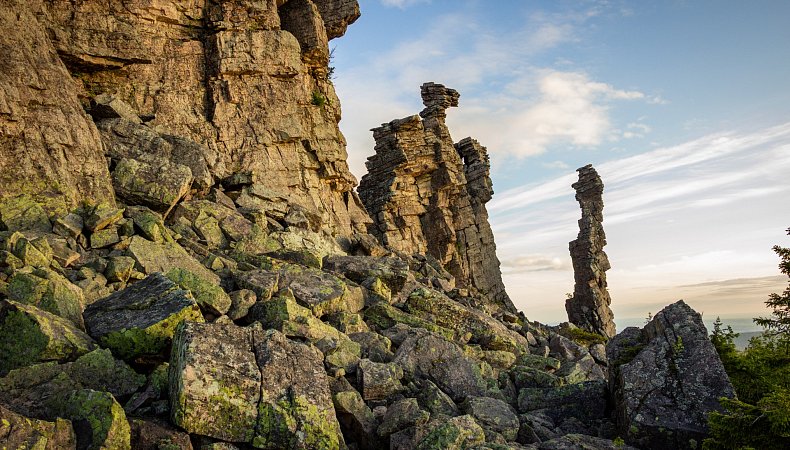 Помяненный камень – расположен на Северном Урале, в Красновишерском районе Пермского края. Максимальная высота горы достигает 781 м, вытянут почти на 6 км. Хотя гора невысока, она сразу завораживает своим видом. Главная изюминка горы – поднимающиеся над ней многочисленные скалы-останцы причудливых форм, видимые даже издалека. Высота скал достигает 30 м. Благодаря им, Помянённый камень – одна из самых красивых и оригинальных вершин Урала. Со стороны гора может напомнить ощетинившуюся спину огромного динозавра. А кому-то скалы напоминают руины древнего замка. Сверху открывается великолепный вид на окрестности – на леса и горы. Хорошо видны Полюдов камень, Тулымский камень и другие вершины. Ветлан – отвесная система скалистых утесов высотой до 263 м. Со смотровой площадки видно изгиб реки Вишеры и гору Полюд, которая напоминает застывшую волну.