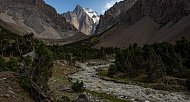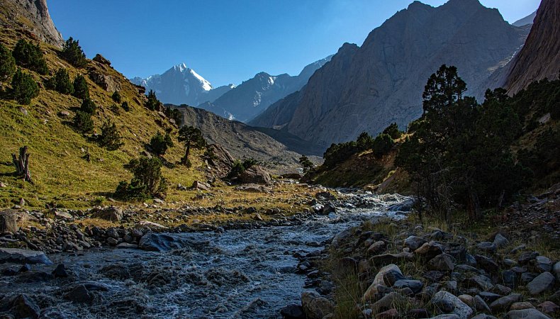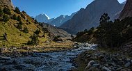 Поднимаемся по долине Ак-Таш на одноименный перевал по набитой тропе. Сверху открываются виды на главные вершины-пятитысячники Туркестанского хребта, увенчаные ледниками. Спускаемся на ручей Джалгычи