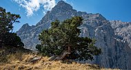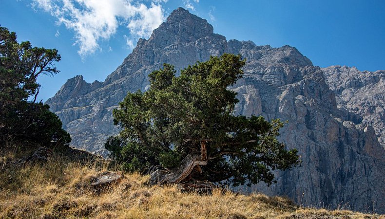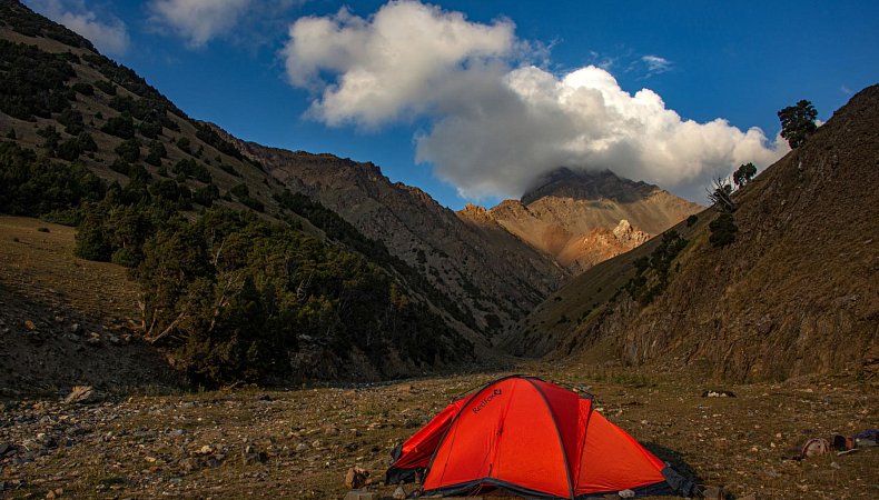 Идем вверх по течению Орто-Чашма и поворачиваем вдоль её притока Ак-Тюбек. Набираем часть высоты до одноименного перевала и встаем лагерем выше зоны леса с видами на окружающие горы.